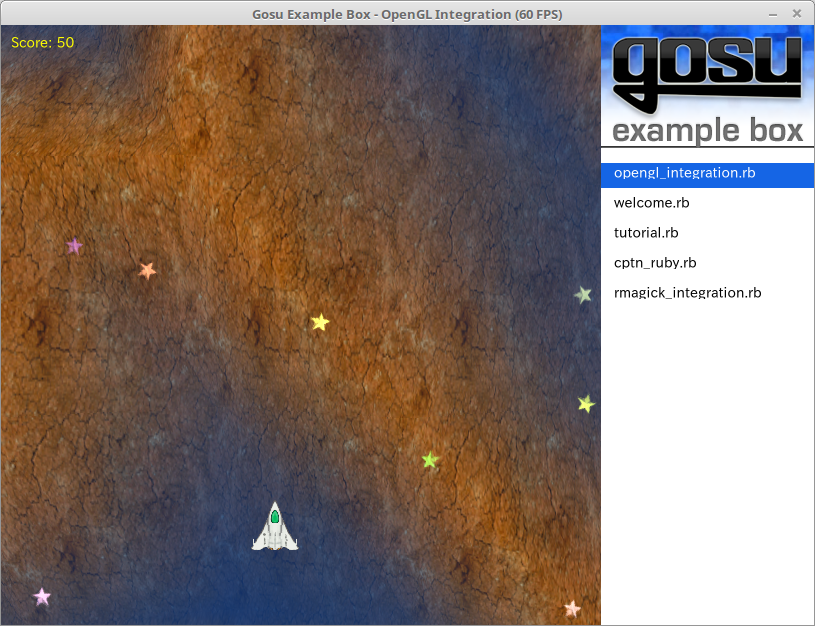 公式サイトはこれです。インストールは、僕は Bundler でインストールしました。ついでに、gem 'gosu-examples' もインストールしておくとよいでしょう。僕の環境では $ bundle exec gosu-examples --fullscreen でデモが立ち上がります。